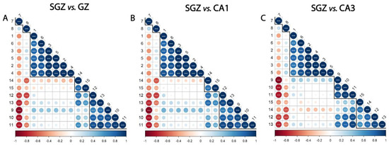 Subgranular zone (SGZ) and CA3 layers show distinctive clustering patterns. Correlation analysis of (A) SGZ vs. granular zone (GZ), (B) SGZ vs. CA1, (C) SGZ vs. CA3. Peaks are grouped and ordered by hierarchical clustering with Ward’s linkage. Numbers on the axes denote the peaks assigned to biomolecules, using the same annotation as in Table 1. The degree of pairwise correlation, as indicated by Pearson’s correlation coefficient, is represented through a combination of a color gradient and varying circle sizes, with the colors reflecting the nature of the correlation (positive or negative) and the circle size reflecting the value of the coefficient. The significance of the correlation is indicated by the label * inside the circle (* p ≤ 0.05, ** p ≤ 0.01, *** p ≤ 0.001). Bold lines indicate clusters.