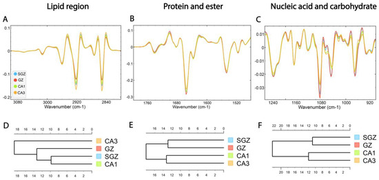Following correlation analysis, HCA was conducted on the processed spectra. The dendrograms were constructed based on average spectra of selected spectral regions—lipid (3100–2800 cm−1), protein and ester (1800–1480 cm−1) and nucleic acid and carbohydrate (1270–800 cm−1)—originating from different hippocampal layers (Figure 3A–C). The dendrogram based on spectra acquired in the lipid region revealed that the SGZ has the highest degree of similarity with CA1 (Figure 3D). In the protein and nucleic acids region, the same clustering pattern was observed. The SGZ and GZ layers were grouped together into the first main cluster, and CA1 and CA3 formed the second one (Figure 3E,F).