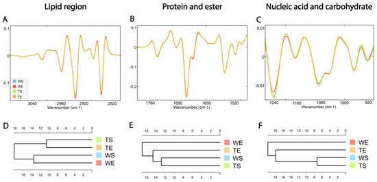 The dendrogram based on spectra acquired in the lipid region revealed that the WS and WE groups formed one cluster, while TS and TE formed the other one (Figure 6D). The effect of the genotype was apparent regardless of the effect of the environment. In the protein and ester (1800–1480 cm−1) and nucleic acid and carbohydrate regions (1270–900 cm−1), the WE group formed a separate cluster, indicating the influence of EE on the composition of these two groups of molecules. Also, the TE group was clustered closer to the group of WS and TS than to WE (Figure 6E,F).