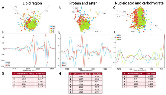 The SGZ, GZ, CA1 and CA3 layers differ in biomolecular composition, most prominently in the nucleic acid region. The PCA-LDA score plots with PCs show the distribution of spectral data of different hippocampal regions in the (A) lipid spectral region 3100–2800 cm−1, (B) protein and ester region 1800–1480 cm−1 and (C) nucleic acid and carbohydrates region 1270–800 cm−1. The loading plots (D–F) show the contribution of individual absorbance to the PCAs of the selected PCs. The RF classification (G–I) shows the ranking of the peaks that contribute the most to the data classification.