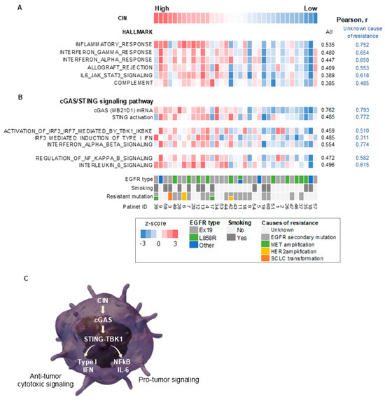 CIN correlated with cGAS–STING and its downstream signaling in EGFR-mutated non-small-cell lung cancer with acquired resistance to EGFR-TKIs. (A) A heatmap sorted by CIN z-score of hallmark-based gene signatures in the EGFR-mutated tumors with acquired resistance to EGFR-TKIs. (B) A heatmap sorted by CIN z-score of gene expression or gene signatures for cGAS–STING and its downstream signaling in the EGFR-mutated NSCLC tumors that have acquired resistance to EGFR-TKIs. (C) A schematic diagram showing a signaling pathway thought to be caused by CIN in EGFR-mutated NSCLC tumors with acquired resistance to EGFR-TKIs. CIN, chromosomal instability; EGFR, epidermal growth factor receptor; r, Pearson correlation coefficient; IL-6, interleukin 6; STING, stimulator of interferon response cGAMP interactor 1; TBK1, TANK-binding kinase 1; IFN, interferon; cGAS, cyclic GMP–AMP synthase; NF-κB, nuclear factor-kappa B.