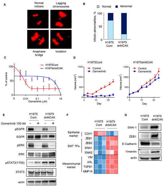 The effects of osimertinib on intracellular signaling were evaluated in chromosomally unstable NSCLC cells. In both H1975Cont and H1975dnMCAK cells, osimertinib decreased the autophosphorylation of EGFR and its downstream ERK phosphorylation (Figure 3E). In contrast, STAT3 phosphorylation was greater in H1975dnMCAK cells than in H1975Cont cells and was maintained under EGFR-TKI exposure (Figure 3E). Because activated STAT3 potentially induces epithelial–mesenchymal transition (EMT), we evaluated the expression of EMT transcription factors (EMT-TFs) and epithelial or mesenchymal markers in H1975Cont and H1975dnMCAK clone cells. The H1975dnMCAK clones showed a decrease in the expression of the epithelial marker CDH1 compared to the H1975Cont clones, whereas the H1975dnMCAK clones showed an increase in EMT or EMT-TF markers including ZEB1,2, SNAI1,2, and VIM and AXL (Figure 3F) [33]. In addition, H1975dnMCAK cells showed decreased expression of the epithelial marker E-cadherin and increased EMT-TFs snai1, zeb1 protein, and the mesenchymal marker vimentin protein compared to H1975Cont cells (Figure 3G).