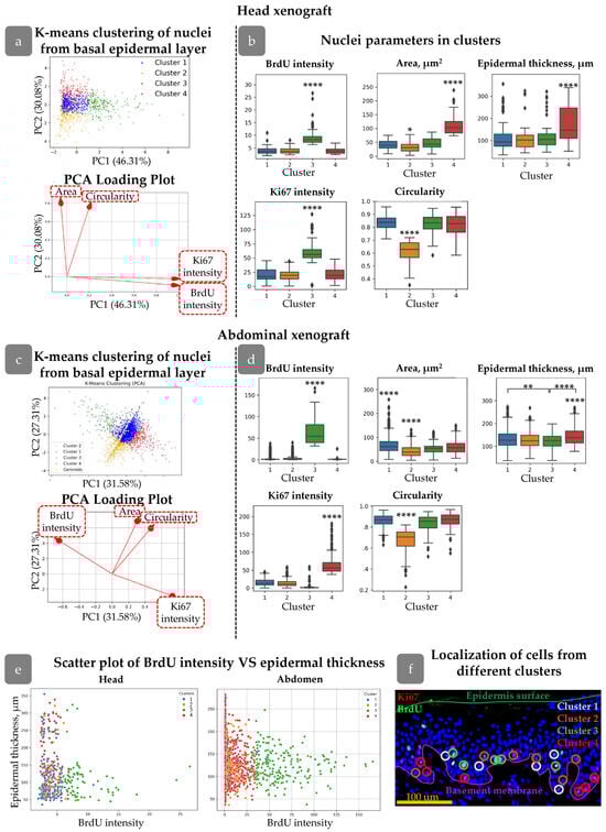 Clustering of Ki67+/BrdU+ nuclei in head (a,b) and abdominal (c,d) xenografts. (a,c) Principal component analysis (PCA) and PCA loading plots of analysed cells showing four clusters in the PC coordinates. (b,d) Morphological parameters of nuclei from four clusters. Outliers are shown on graph. **—p<0.01, ****—p < 0.0001 relative to other clusters (one-way ANOVA with Tukey correction for multiple comparisons). (e) Scatter plots of BrdU intensity versus epidermal thickness for cells from different clusters. (f) Examples of cells from different clusters in skin stained with BrdU (green), Ki67 (red), and DAPI (blue). Scale bar: 100 µm.