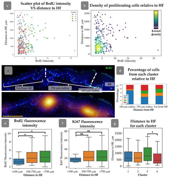 (a) Scatter plot of BrdU intensity against the distance to HF for cells from different clusters. (b) Density scatter plot of BrdU intensity against the distance to HF (kernel density estimation) showing higher proliferating cell density around HFs. (c) Top—an example of cell category identification based on the distance from HF. Bottom—BrdU density map overlaid onto the top image. Dotted lines split the epidermal regions identified based on the distance from HF. Blue staining—DAPI. Scale bar—400 µm. (d) Percentage of cells from each cluster at different distances from HF. (e,f) BrdU (e) and Ki67 (f) fluorescence intensities for cells located at different distances from HF. (g) Mean distance to HF for cells from each cluster. * p < 0.05, ns—no significant differences (one-way ANOVA with Tukey correction for multiple comparisons).