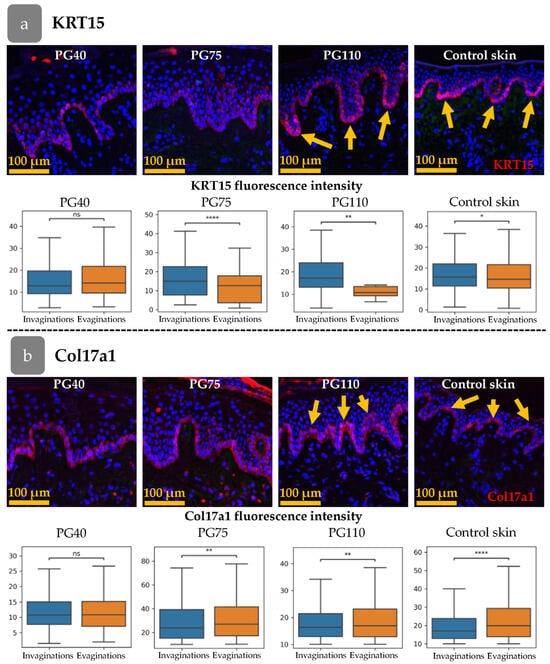 The fluorescence intensity of KRT15 and Col17a1 was analysed in the cells of the basal epidermal layer (Figure 6a,b). The cells were categorised according to their position in the invaginations or evaginations, based on the thickness of the epidermis at the location of the cell. The fluorescence intensity was then compared between the invaginations and evaginations. Firstly, we examined the distribution of the markers in intact skin. The intensity of KRT15 was higher in invaginations that corresponded to rete ridges, while Col17a1 was upregulated in evaginations (inter-ridges).