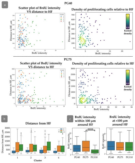 (a) Distribution of cells with varying BrdU intensities relative to HFs at PG40 (top) and PG75 (bottom). (Left): scatter plot of BrdU intensity against distance to HF for cells from different clusters. (Right): Density scatter plot of BrdU intensity against distance to HF (kernel density estimation). (b) Distance to HF for each cluster during regeneration. (c) BrdU intensity for cells at different distances from HF. ****—p < 0.0001. Statistical analysis: ANOVA with Tukey correction for multiple comparisons.