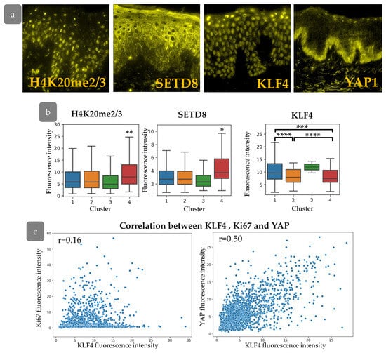 We next studied the expression of KLF4, which is considered as a master-gene of epidermal differentiation. KLF4 is thought to encourage the differentiation of epidermal cells; its suppression preserves the stem and progenitor status of keratinocytes [,]. We observed decreased KLF4 expression in epidermal Clusters 2 and 4 (Figure 9b). While Cluster 2 expresses low levels of SETD8 compared to Cluster 4, low expression of KLF4 in combination with small, elongated nuclei indicates a less differentiated state. KLF4 is often considered to interact with the YAP/TAZ-TEAD complex mediating keratinocyte differentiation. Basically, YAP antagonises KLF4 to preserve undifferentiated cell state and promote proliferation [].