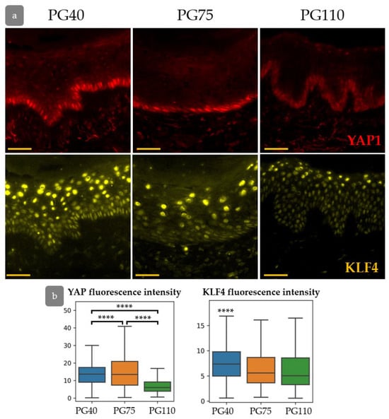 Next, we investigated YAP activity and KLF4 expression during epidermal regeneration (Figure 10a). The expression of both KLF4 and YAP was elevated at PG40. Active nuclear YAP was detected not only in the basal layer of the epidermis but also in individual keratinocytes in suprabasal layers. The expression of KLF4 returned to the normal state by PG75, while YAP expression gradually decreased and achieved a minimum at PG110 (Figure 10a,b). KLF4 is able to upregulate the expression of YAP [], and both factors may be crucial for the early regeneration stages. In the later stages of regeneration, activated YAP may induce hypertrophy and hyperproliferation of the epidermis [,,].
