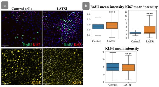 The analysis of primary keratinocyte culture. (a) IHC staining of keratinocytes with BrdU, Ki67 (top), and KLF4 (bottom). Scale bar: 100 µm. (b) Measurement of the total BrdU, Ki67, and KLF4 fluorescent intensities in cells in control cells compared to cells with LATSi treatment. ****—p < 0.0001 (one-way ANOVA with Tukey correction for multiple comparisons).