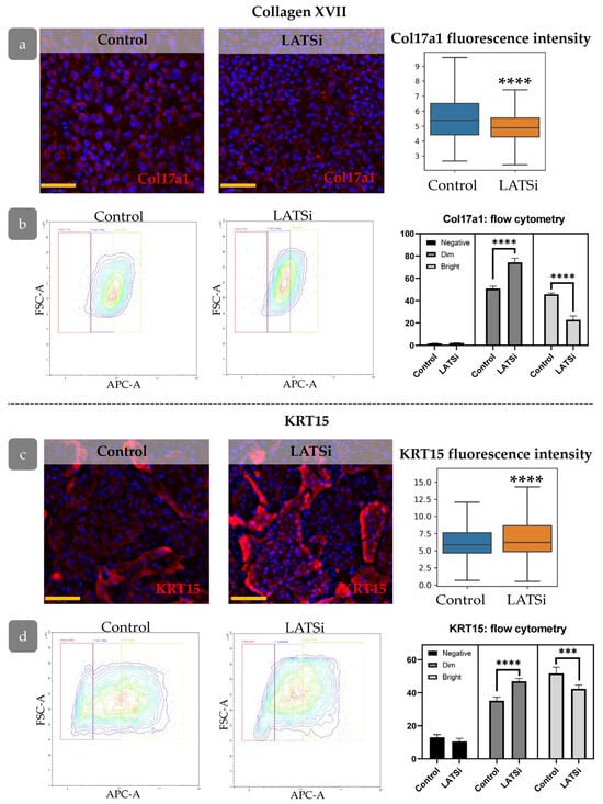 The expression of markers associated with epidermal relief formation in cell culture: (a,b)—Col17a1, (c,d)—KRT15, (a,c) IHC staining for the analysed markers, blue staining—DAPI, scale bar: 100 µm (left) and measurement of the overall marker fluorescence intensity in the cell population (right). (b,d) Flow cytometry analysis of primary keratinocytes. (Left)—representative flow cytometry contour plot. (Right)—the percentages of cells within different categories (negative, dim, and bright). ****—p < 0.0001 (one-way ANOVA with Tukey correction for multiple comparisons).