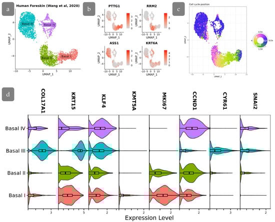 scRNA-seq analysis of human foreskin. (a) UMAP projection of basal cell subpopulations based on single-cell RNA-seq data from Wang et al., 2020 []. (b) Feature plots showing the expression of specific gene markers in basal cell subpopulations. (c) Visualization of cell cycle position on UMAP embeddings. (d) Stacked violin plots showing the expression of genes of interest among basal cell subpopulations.