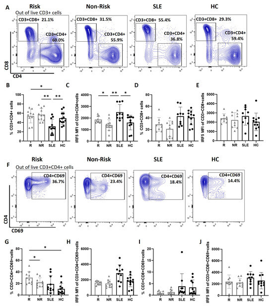Increased IRF5 expression was observed within CD4+ T cells from SLE patients and healthy IRF5-SLE homozygous risk carriers. PBMCs from SLE patients, age- and sex-matched non-genotyped healthy controls (HCs), and healthy controls genotyped for the IRF5-SLE homozygous risk and non-risk haplotype were immunophenotyped by multi-color flow cytometry to assess circulating T cell subsets. We observed a significant reduction in SLE blood total CD4+ T cells as compared to both genotyped and non-genotyped healthy controls [23,24,25]. No differences were seen between healthy donor IRF5-SLE homozygous risk (R) and non-risk (NR) carriers (Figure 1A,B, Supplementary Figure S1A,B). Interestingly, we detected a significant increase in IRF5 expression within SLE CD4+ T cells as compared to non-genotyped healthy controls, and this difference was conserved between homozygous risk and non-risk donors [17,26,27] (Figure 1C). No significant differences were observed in CD8+ T cells (Figure 1A,D,E, Supplementary Figure S1A,B). We next examined T cell activation using CD69 as a marker. Somewhat surprisingly, we only detected a significant increase in the percentage of CD4+CD69+ T cells from IRF5-SLE homozygous risk carriers and not from SLE patients (Figure 1G, Supplementary Figure S1C). Lastly, there was no significant difference in IRF5 expression within activated CD4+CD69+ T cells between groups (Figure 1H), nor was there a difference in CD8+CD69+ activation levels or IRF5 expression (Figure 1I,J).