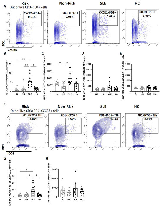 As previously reported [9,10,11,12], we found a significant increase in the percentage of CD4+PD1+CXCR5+ cTfh in SLE patients that are the counterpart of GC Tfh. No difference was found between genetic risk carriers (Figure 2A,B, Supplementary Figure S1A,D). Consistent with our findings in total CD4+ T cells, we detected significantly higher IRF5 expression in cTfh from risk as compared to non-risk carriers (Figure 2C), with no difference in Bcl6 or ICOS expression levels (Figure 2D,E). Importantly, we detected an increase in the percentage of PD1+ICOS+ cTfh cells in SLE patients, which denotes an activated state, yet differences were not seen between genotyped carriers (Figure 2F,G, Supplementary Figure S1A,E). Lastly, there was no difference in IRF5 expression within PD1+CXCR5+ICOS+ Tfh cells from each group (Figure 2H).