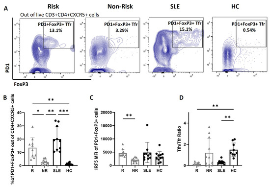 Increased circulating Tfr cells in SLE patients and IRF5-SLE homozygous risk carriers. (A) Representative flow cytometry plots of CD3+CD4+CXCR5+PD1+FOXP3+ Tfr cells from donor cohorts; IRF5-SLE homozygous risk carriers (R), homozygous non-risk (NR), and SLE and healthy controls (HCs). (B–D) Graphical summary of flow data showing percentages of CD3+CD4+CXCR5+PD1+FOXP3+ Tfr cells (B), IRF5 MFI within CD3+CD4+CXCR5+PD1+FOXP3+ TFR cells (C), and ratio of Tfh to Tfr cells (D). NR, n = 10–12; R, n = 9–10; SLE, n = 10–11; HC, n = 11–12. Data are presented as mean ± SD. p values are reported after one-way ANOVA mixed-effects analysis. ***, p < 0.001. **, p < 0.01. *, p < 0.05.