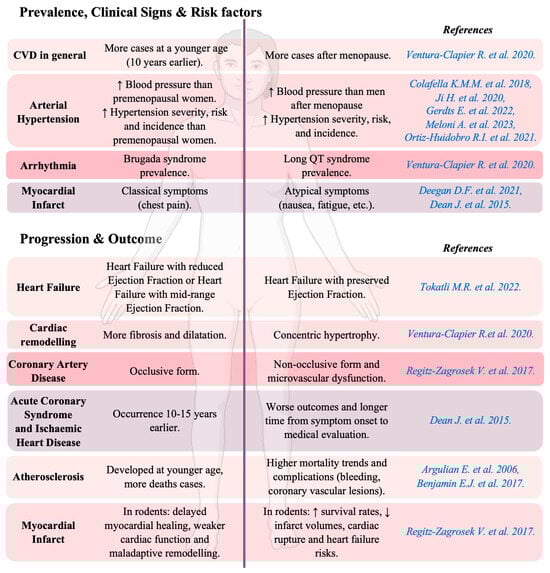 Under pathological conditions, sex-related cardiovascular dimorphism is heightened, notably in terms of CVD prevalence, risk factors, clinical signs and symptoms, disease evolution, and outcome (Figure 1).