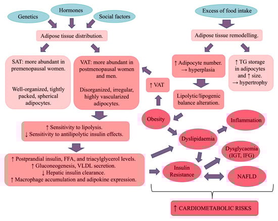 Connections between components of metabolic syndrome and risk of cardiovascular disease. Genetics, hormones, social factors, and food intake influence adipose tissue disposition. Fat accumulation leads to the development of several risk factors for cardiometabolic diseases. Abbreviations: FFA, free fatty acid; IFG, impaired fasting glucose; IGT, impaired glucose tolerance; NAFLD, non-alcoholic fatty liver disease; SAT, subcutaneous adipose tissue; TG, triglyceride; VAT visceral adipose tissue; VLDL, very low-density lipoprotein.