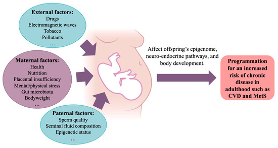 The concept of DOHaD originated in the 1980s with the publication of an epidemiological report by Professor Barker’s, who observed an inverse correlation between the standardized mortality of ischaemic heart disease and individual birth weight [77]. The DOHaD concept proposes that a change in the environment during a critical developmental period early in life can induce permanent changes in the structure and function of certain organs, potentially leading to the later development of chronic diseases [78]. This critical period of vulnerability is currently considered to include the first thousand days of life, from the periconceptional period until the second birthday [79]. During this time window, exposure to stress factors such as altered maternal nutritional status, toxic substances, or gestational complications that perturb the in-utero environment may predispose the individual to the later onset of cardiometabolic disease (Figure 5). In addition, recent data have shown that paternal conditions, such as sperm quality, epigenetic status, and seminal fluid composition, may also influence the development of these diseases [80].