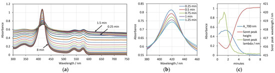 Figure 1b shows excerpts of the spectra (in the range of the Soret peak) taken during the initial stage of the process up to 1.25 min. It can be seen that during this period, the changes in the spectra are in the opposite direction compared to the main stage of the hemolysis process. Namely, the background due to the light scattering increases and the Soret peak height decreases in its absolute value, as well as when expressed as height relative to the background of the spectrum. A slight shift in the peak wavelength can also be noticed.