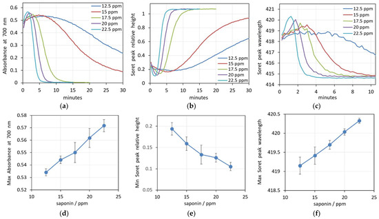 (a–c) Changes in spectra parameters during hemolysis caused by five increasing concentrations of saponin in 0.05% Hct suspensions. (a) Absorbance at 700 nm, (b) Soret peak height, (c) Soret peak wavelength. (d–f) Concentration dependence of the prehemolytic values of spectra parameters. (d) Maximum absorbance at 700 nm, (e) Soret peak height at its minimum, (f) Soret peak wavelength at its maximum. (n = 5).