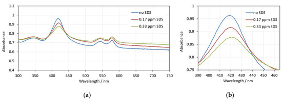 (a) Spectra of erythrocyte suspension with 0.07% Hct in the presence of different amounts of SDS—no SDS, 0.17 ppm SDS and 0.33 ppm SDS; (b) enlarged view of the same spectra in the range 390–460 nm. The spectra are measured at the 30th minute after addition of SDS to the erythrocytes.