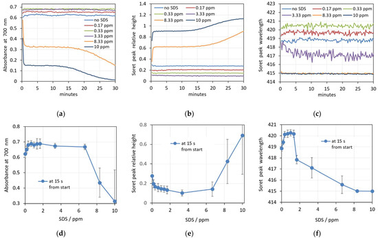 (a–c) Changes in the spectral parameters after the addition of five increasing concentrations of SDS: (a) absorbance at 700 nm; (b) Soret peak relative height; (c) Soret peak wavelength. (d–f) Concentration dependence of the prehemolytic values of spectra parameters taken 15 s after the addition of SDS: (d) maximum absorbance at 700 nm, (e) Soret peak height at its minimum, (f) Soret peak wavelength at its maximum. (n = 5).