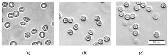 Microscopic images demonstrate the effect of SDS on the shape of erythrocytes. The suspensions contain erythrocytes in PBS at Hct 0.07% and: (a) 0 ppm SDS; (b) 0.33 ppm SDS; (c) 3.33 ppm SDS.