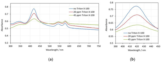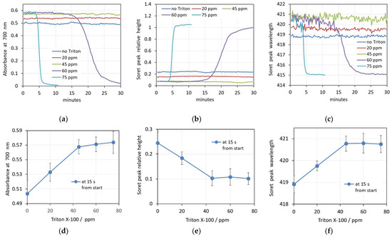 The concentration dependence of the prehemolytic values of spectra parameters after the addition of Triton X-100 are shown in Figure 9d–f. It can be seen that up to a concentration of 45 ppm Triton X-100, the observed values of all three parameters change linearly, while above 45 ppm and up to 75 ppm, the parameters remain constant. This can also be seen in Figure 9a–c, where the curves for concentrations above 45 ppm Triton X-100 start at very close values. However, while 45 ppm Triton X-100 keeps the spectra parameters constant for 30 min, concentrations of 60 ppm and 75 ppm Triton X-100 cause hemolysis. This is detected as a quickly decreasing background (decreasing absorbance at 700 nm with simultaneously increasing relative height of the Soret peak) and a drop of the Soret peak wavelength from 421 to 415 nm, indicating changes in the oxygenation state of the released Hb.