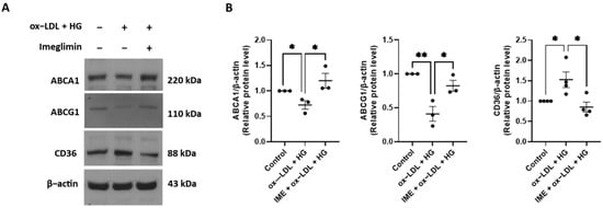 Cholesterol efflux in macrophages is known to be regulated by ABCA1 and ABCG1. Therefore, we examined the effects of imeglimin on ABCA1 and ABCG1 expression levels. Imeglimin increased the expression of ABCA1 and ABCG1 proteins compared to that in ox-LDL/HG-treated THP-1 macrophages (Figure 3).