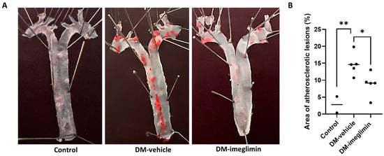 En face analyses of Oil Red O-stained atherosclerotic plaques in the aortic arch and thoracic aorta of mice from the different groups demonstrated that the percentage area of atherosclerotic plaques was significantly increased in mice from the DM-vehicle group compared to that in mice from the control group. Moreover, imeglimin administration significantly reduced the atherosclerotic plaque area in mice from the DM-imeglimin group compared to that in mice from the DM-vehicle group (Figure 6).