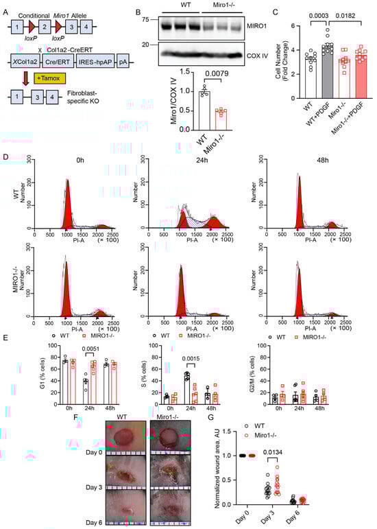 MIRO1 is required for proliferation in vitro and wound healing in vivo. (A) Schematic depicting the genetic strategy used to generate fibroblast-specific MIRO1−/− mice. Miro1fl/fl mice were crossed with mice expressing tamoxifen-inducible, fibroblast-specific Cre recombinase, Col1a2CreERT. Tamoxifen was administered (80 mg/kg/day) for a total of 10 days to induce fibroblast-restricted Cre expression. (B) Representative immunoblot for MIRO1 in mitochondrial fractions of lysates from the skin of WT and Miro1−/− mice after wound closure. The quantification of MIRO1 protein is adjusted to COX IV; n = 5 mice per group. (C) Cell counts of skin fibroblasts explanted from WT and Miro1−/− mice incubated in media containing 10% FBS with and without PDGF for 72 h (20 ng/mL); n = 10 independent experiments. (D) Representative FACS analysis for DNA content in synchronized/growth-arrested WT and MIRO1−/− skin fibroblasts at 0 h and after release from arrest with 10% FBS for 24 h and 48 h. (E) Cell cycle phase distribution (% of cells) of skin fibroblasts in the G1, S, and G2/M phases; n = 4–6 independent experiments. (F) Representative images of wounds after intrascapular skin punch at days 0 (immediately after punch), 3, and 6 in WT and Miro1-/- mice. The scale depicted below the images represents 1 mm. (G) Quantification of wound areas. Data were normalized to the wound area at day 0; n = 14 mice per genotype. Data are shown as the mean ± SEM. Analyses were performed using the Mann–Whitney test (B), one-way ANOVA (C), two-way ANOVA (or mixed model) (E), or two-way ANOVA (G).