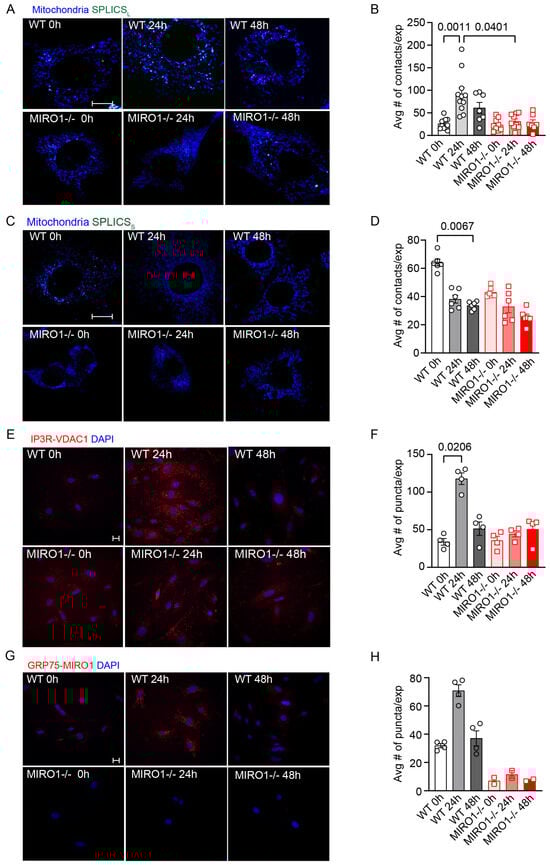 Next, cell cycle changes in the ER–mitochondria distance were assessed by measuring the number or cleft distances of mitochondrial ER contact sites (MERCS). As previously reported, split-GFP-based contact sensors (SPLICS) can be expressed [], with SPLICSL and SPLICSS indicating a cleft distance of approximately 40 nm and 10 nm, respectively. Equal expression of the SPLICS in WT and MIRO1−/− cells was verified by immunoblotting for GFP (Supplementary Figure S2A,B). In cycling WT VSMCs, the number of SPLICSL fluorescence signals increased significantly at 24 h compared with 0 h, while SPLICSS signals were highest at 0 h and decreased at 24 and 48 h, suggesting that the interaction between mitochondria and the ER changes throughout the cell cycle. In MIRO1−/− VSMCs, however, neither SPLICSS nor SPLICSL signals significantly changed during the cell cycle (Figure 2A–D), and significantly fewer SPLICSL signals were detected at 24 h in MIRO1-/- compared with WT VSMCs. Additionally, the ER–mitochondrial distance in proliferating, non-synchronized VSMCs from WT and smooth-muscle-cell-specific MIRO1 knockout mice was analyzed by transmission electron microscopy (Qian, in review) []. Overall, the distance was reduced with MIRO1 deficiency compared with WT conditions (Supplementary Figure S2C,D).