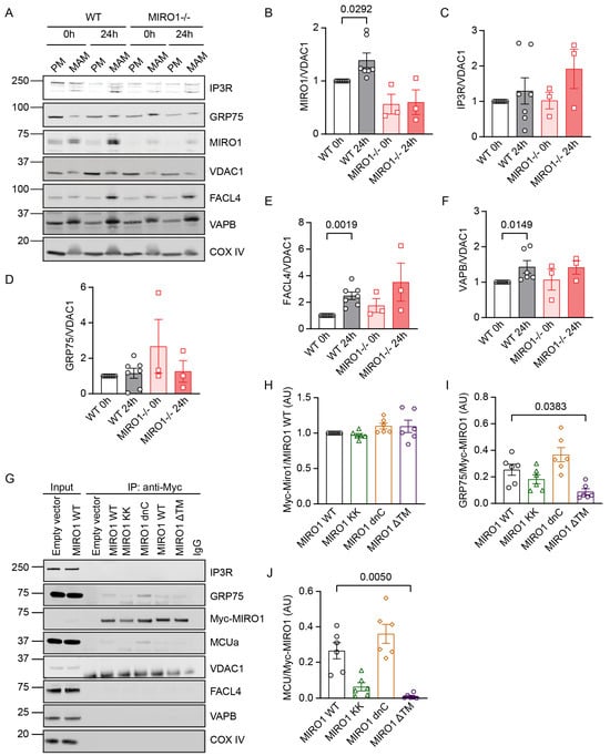 MIRO1 resides at MAM interfaces and interacts with Ca2+-transfer MERCS proteins. (A) Representative immunoblots for MERCS proteins in fractions of purified mitochondria (PM) and of mitochondria-associated membranes (MAMs) isolated from WT and MIRO1−/− skin fibroblasts following synchronization in serum-free medium (0 h) and at 24 h after release from growth arrest in medium containing 10% FBS. PM: purified mitochondria, MAM: mitochondria-associated membrane. Markers for MAMs and ER (FACL4) and mitochondria (cytochrome c oxidase (COX IV)) were also examined. VDAC1 was used as a loading control. (B–F) Quantification of the immunoblot experiments as in (A). (B) MIRO1, (C) IP3R, (D) GRP75, (E) FACL4, and (F) VAPB levels, adjusted to VDAC1; n = 3–7 independent experiments. (G) Coimmunoprecipitation (co-IP) analysis of MIRO1 WT, MIRO1 KK, MIRO1 dnC, and MIRO1 ΔTM with MERCS proteins. c-Myc-tagged MIRO1 constructs were expressed in HEK cells for 24 h, and cell lysis and pull-down assays were performed. (H–J) Quantification of the co-IP experiments shown in (G). (H) MIRO1 expression in MIRO1 KK, MIRO1 dnC, and MIRO1 ΔTM adjusted to MIRO1 WT. (I) GRP75 and (J) MCU levels, adjusted for immunoprecipitated c-Myc-tagged MIRO1; n = 6 independent experiments. Data are shown as the mean ± SEM. Analyses were performed using the Kruskal–Wallis test.