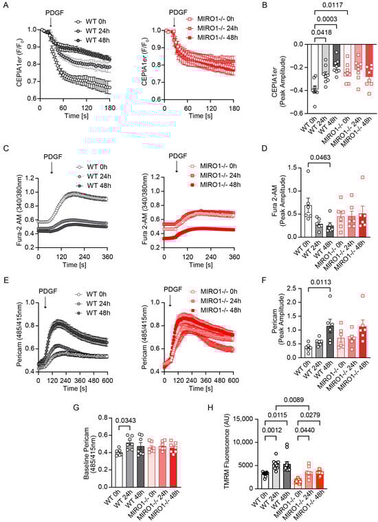 The IP3R-GRP75-VDAC1 complex is a critical mediator of Ca2+ signals from the ER to mitochondria [,]. Previous studies demonstrated that subcellular [Ca2+] fluctuate with the cell cycle [,]. Therefore, proliferating WT vs. MIRO1−/− VSMCs were compared for differences in [Ca2+]. PDGF-induced ER Ca2+ transients measured with CEPIA1er were highest at 0 h, decreased somewhat at 24 h, and significantly decreased at 48 h. Notably, in MIRO1−/− cells, ER Ca2+ release was reduced at 0 h compared with WT controls and remained unchanged at later time points (Figure 4A,B; Supplementary Figure S4A). To measure the effect on cytosolic [Ca2+], Fura 2-AM recordings were performed following the addition of PDGF. In WT cells after PDGF treatment, the peak amplitude and AUC were highest at 0 h and decreased at 24 and 48 h but remained unchanged in MIRO1−/− cells (Figure 4C,D; Supplementary Figure S4B).