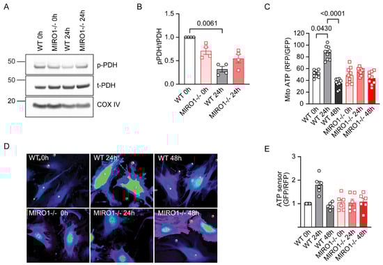 Furthermore, mitochondrial ATP contributes to intracellular ATP levels. Thus, a decrease in mitochondrial ATP in MIRO1-/- cells could affect intracellular ATP levels. Accordingly, at 24 h compared with 0 h, WT cytosolic ATP levels in both VSMCs and fibroblasts were increased but remained unchanged in MIRO1-/- cells (Figure 5D,E; Supplementary Figure S8E). Taken together, these data demonstrate that MIRO1 supports mitochondrial Ca2+ influx, PDH activation, and the mitochondrial ATP production.