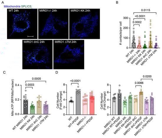 MIRO1 EF hands and transmembrane domain is required for MERCS formation, increased ATPlevels and cell proliferation in skin fibroblasts. (A) Representative images of WT skin fibroblasts and MIRO1−/− skin fibroblasts expressing MIRO1 KK, MIRO1 dnC, or MIRO1 ΔTM and a split-GFP-based contact-site sensor for wide juxtaposition (40–50 nm) between the ER and mitochondria (SPLICSL; green) colocalized with mitochondria (MitoTracker; blue) after release from arrest with 10% FBS for 24 h. Scale bar = 20 µm, ×63. (B) Quantification of the SPLICSL shown in (A); n = 30 to 65 cells for each group from 5 independent experiments. (C) Quantification of mitochondrial ATP levels at 24 h in WT skin fibroblasts and MIRO1−/− skin fibroblasts expressing MIRO1 KK, MIRO1 dnC, or MIRO1 ΔTM after release from growth arrest with 10% FBS; n = 12 independent experiments. (D) Cell counts of WT skin fibroblasts and MIRO1−/− skin fibroblasts incubated in media containing 10% FBS with and without PDGF for 72 h (20 ng/mL); n = 10 independent experiments. (E) Cell counts of MIRO1−/− skin fibroblasts expressing MIRO1 WT, MIRO1 KK, MIRO1 dnC, or MIRO1 ΔTM incubated in media containing 10% FBS with and without PDGF for 72 h (20 ng/mL); n = 10 independent experiments. Data are shown as the mean ± SEM. Analyses were performed using Kruskal–Wallis (B,D,E) and one-way ANOVA (C) tests.