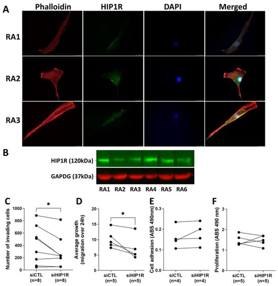 HIP1R protein is present in RA FLS and knockdown significantly affects cell behavior. (A) Immunofluorescence staining demonstrating that HIP1R (green) protein is expressed in RA FLS, and localized near the cell edge. Phalloidin stain actin filaments (red) and DAPI stains of the nucleus (blue) (three representative cell lines are shown; 600× magnification). (B) Western blots done with RA FLS cell lysates confirming the presence of the HIP1R protein (green) in RA FLS (n = 6). GAPDH (red) was used as loading control. (C) siRNA knockdown of HIP1R in RA FLS significantly reduced cell invasiveness (n = 8, p = 0.0419, paired t-test), (D) and also reduced cell migration in the scratch/wound healing assay (n = 5, p = 0.0413, paired t-test). (E) HIP1R knockdown did not have any significant effect in RA FLS adhesion (n = 4) (F) or on three-day proliferation (n = 5). (RA1 to RA6 refers to individual RA patient cell line; ABS = Absorption; see Table 1 for demographic data). (* statistically significant with p < 0.05).