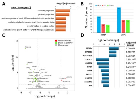 Biologic Pathways and genes enriched in HIP1R knockdown studies. (A) GO pathways enriched among DEGs in siRNA HIP1R versus control (adj p-value = adjusted p value). (B) Numbers of DEGs in siRNA HIP1R versus siRNA control, and in siRNA HIP1 versus control. (C) Volcano plot showing DEGs (red = up in siRNA HIP1R; green = down in siRNA HIP1R; grey = unchanged). (D) DEGs that remained significant after p-value adjustment, including down-regulated genes TXNDC12, GABBR2, GPR56, AKT1S1, PDGFRB, HIP1R, SLC2A4RG, and EZR, and up-regulated genes CYP26B1, STEAP4, and ADAMTS15.