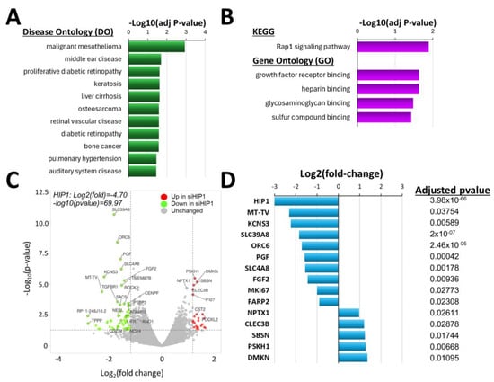 Biologic pathways and genes enriched in HIP1 knockdown studies. (A) DO terms such as “malignant mesothelioma”, “proliferative diabetic retinopathy”, “liver cirrhosis”, and “osteosarcoma” were enriched in siRNA HIP1 versus siRNA control analyses (adj p-value = adjusted p value). (B) KEGG pathway “Rap1 signaling pathway” was the most significant, followed by GO pathways “growth factor receptor binding”, “heparin binding”, “glycosaminoglycan binding”, and “sulfur compound binding”. (C) Volcano plot showing DEGs (red = up in siRNA HIP1; green = down in siRNA HIP1; grey = unchanged; HIP1 significance and fold change is shown in the upper left corner). (D) DEGs that remained significant after p-value adjustment for multiple tests included down-regulated FGF2, KCNS3, MT-TV, ORC6, PGF, and SLC39A8, and up-regulated CLEC3B, DMKN, PSKH1, and NPTX1.