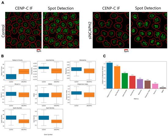 The analysis of imaging data was carried out using HiTIPS, a high-throughput image analysis software designed to analyze cell-based assays in fixed and live cells as previously described [25]. Maximally projected DAPI images were used for nucleus segmentation, while CENP-C images were used for CENP-C spot finding and localization. Specific analysis parameters were selected in HiTIPS tailored to align with the average nucleus size, as well as the size and brightness of the centromere spots observed. The GPU-based Cellpose algorithm for nuclear segmentation [26] was used in conjunction with the Laplacian of Gaussian method for spot detection. Spot positions were determined as the center of gravity of the segmented spots.