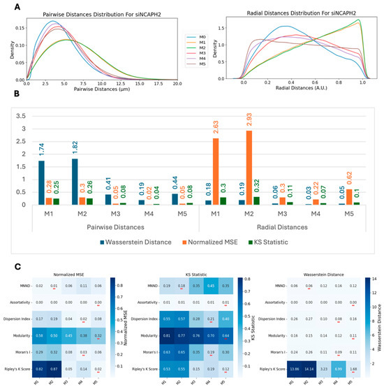 We did notice a clear difference in the performance of the computational models in reproducing centromere distributions in various cell types (Figure 7C). For pairwise distances, except the WTC11 embryonic stem cell line, the M3 model consistently achieved the lowest Wasserstein distance, the normalized MSE, and the KS statistic across most cell lines, indicating that it is the most effective at predicting the observed pairwise distance distributions of centromeres. Similarly, M3 also outperformed other methods when radial distribution was analyzed. M4 followed closely as the second-best performing model, followed by M5, M1, and M2. This trend was observed across most cell lines. M5 exhibited a noticeably weaker predictive performance compared with M1 and M2, which could potentially be attributed to the small number of cells available, which is not sufficient for the more complex M5 model that uses a larger input set (>1000 pairwise distances) to fully capture the spatial organization of centromeres.