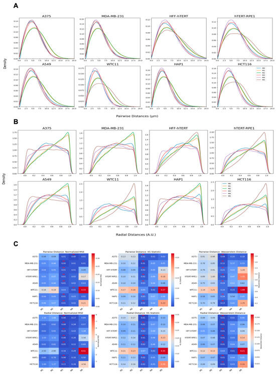 Centromere spatial organization analysis across cell lines, including HCT116 (colon), A375 (melanoma), MDA-MB-231 (breast), HFF-hTERT (fibroblast), hTERT-RPE1 (retinal), A549 (lung), HAP1 (myeloid), and WTC11 (embryonic stem cells). (A) Pairwise distance distributions comparing the experimental data with model predictions. (B) Radial distance distributions showing the models’ ability to capture centromere positioning. (C) Quantitative comparison of model performance using the Wasserstein distance, the normalized MSE, and the KS statistic, demonstrating M3 as the best-performing model across most cell lines, with M4 as the second-best. The ** indicates the minimum value for each row.