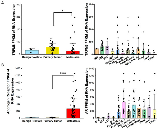 mRNA expression of TRPM8 and AR in PC patients from the UIC Cancer Center. (A) TRPM8 mRNA expression: bar graphs display fragments per kilobase of transcript per million mapped reads (FPKM) for TRPM8 in benign, tumor, and metastatic prostate tissues. The right panel provides FPKM values for individual patient samples. (B) AR mRNA expression: bar graphs show FPKM values for AR across benign, tumor, and metastatic tissues, with individual sample data on the right (Gleason score = GS, GS6 = low grade, GS7 = intermediate, and GS8–9 = high grade) (ANOVA with post hoc Tukey multiple comparisons of different tissues (*, p < 0.05, ***, p < 0.0001; n = 3–51)).
