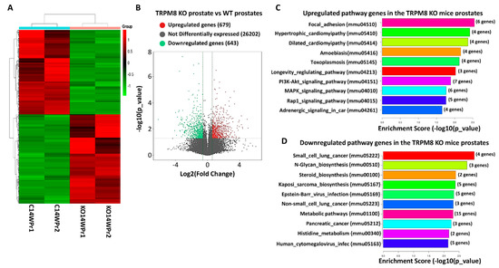 Differential gene expression and pathway enrichment analysis of TRPM8 KO and WT mouse prostates. (A) Hierarchical clustering of differentially expressed genes between TRPM8 KO (n = 2) and wild-type (WT) (n = 2) mouse prostates. Red indicates upregulated genes and green indicates downregulated genes. (B) Visualization of differentially expressed genes with log2 fold change on the x-axis and −log10 p-value on the y-axis. Red and green dots represent significantly upregulated and downregulated genes, respectively, with a fold change cutoff of 1.5 and p-value ≤ 0.05. (C) Displays the top ten enriched pathways of differentially expressed genes (DEGs) in TRPM8 KO compared to WT mouse prostates. The enrichment score is presented as −log10 (p-value), highlighting significant pathways, such as focal adhesion and PI3K-Akt signaling. (D) Displays the top ten downregulated pathways in TRPM8 KO compared to WT mouse prostates. The enrichment score is presented as −log10 (p-value), highlighting significant pathways, such as small cell lung cancer and N-glycan biosynthesis.