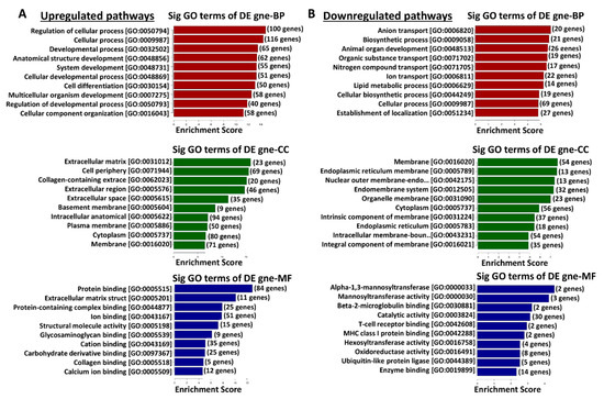 The gene ontology (GO) enrichment analysis for differentially expressed genes in TRPM8 KO prostates reveals distinct patterns of upregulated and downregulated pathways in various biological processes (BPs), cellular components (CCs), and molecular functions (MFs), as shown in Figure 3. In the TRPM8 KO prostates, upregulated pathways in BPs, including those related to cellular processes, developmental processes, and anatomical structure development, suggest enhanced cellular organization and differentiation activities. In CCs, increased expression in terms associated with the ECM, cell periphery, and plasma membrane indicates changes in cell–matrix interactions and cell surface organization. These upregulations are further supported by enrichment in MF terms related to protein binding, ECM structural constituents, and ion binding, suggesting adjustments in cell adhesion, signaling, and stability (Figure 3A). Conversely, downregulated pathways include BP terms associated with anion transport, biosynthetic processes, and lipid metabolic processes, indicating potential shifts in energy dynamics and a decrease in metabolic activity, which may alter cellular homeostasis. In CCs, the downregulation of terms related to the endoplasmic reticulum membrane, nuclear outer membrane, and cytoplasmic membrane suggests possible modifications in membrane structure and intracellular transport functions. Downregulated MF terms, such as mannosyltransferase and oxidoreductase activities, indicate changes in glycosylation and redox reactions, which may impact protein processing and receptor function in prostate cells (Figure 3B). These findings suggest that TRPM8 deletion in prostate tissue affects genes involved in structural organization and extracellular interactions while reducing activity in metabolic and biosynthetic processes. This dual regulation pattern may influence cellular function and tissue homeostasis in TRPM8 KO prostates.