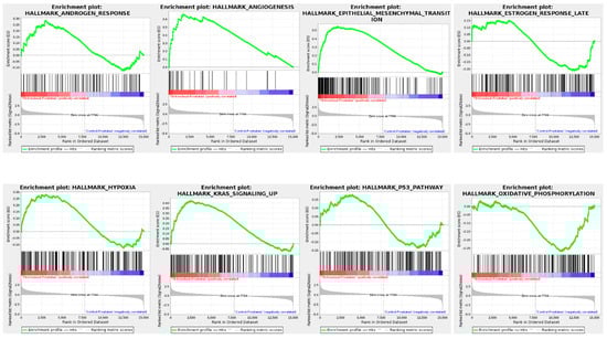 In Figure 4, enriched hallmark pathways include androgen response, angiogenesis, epithelial–mesenchymal transition (EMT), estrogen response, and oxidative phosphorylation. The positive enrichment of androgen and estrogen response pathways in TRPM8 KO prostates aligns with elevated testosterone levels observed in TRPM8 KO mice, which may enhance AR-driven signaling [42]. The enrichment of EMT and angiogenesis pathways suggests a heightened potential for metastasis and blood vessel formation [43], both of which support a pro-tumorigenic environment in the absence of TRPM8. Additionally, pathways like hypoxia and oxidative phosphorylation indicate cellular adaptation to low oxygen conditions [44,45], a common feature in tumor tissues. Figure 5 highlights critical signaling pathways, including AKT, KRAS, MTOR, and MEK, which are essential for cell proliferation and survival. The positive enrichment of these pathways in TRPM8 KO prostates suggests increased proliferative and survival signaling, promoting oncogenic processes in the absence of TRPM8. Tumor suppressor pathways, such as PTEN and P53, also show positive enrichment, possibly indicating a compensatory mechanism [46,47]. The enrichment of PTEN and p53 pathways may represent a compensatory mechanism, where p53-mediated tumor suppression is activated in response to reduced PTEN activity [48].