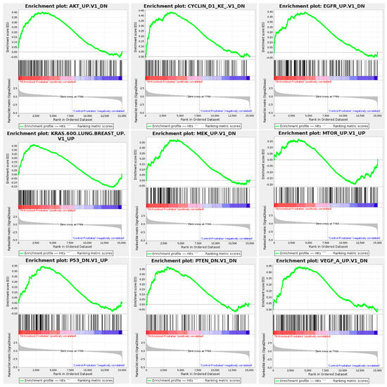 Gene Set Enrichment Analysis (GSEA) of specific TRPM8 KO mouse prostate signaling pathways. Displays enrichment plots for specific signaling pathways significantly altered in TRPM8 KO compared to WT mouse prostates. Key pathways include AKT, Cyclin D1, EGFR, KRAS, MEK, MTOR, P53, PTEN, and VEGF.