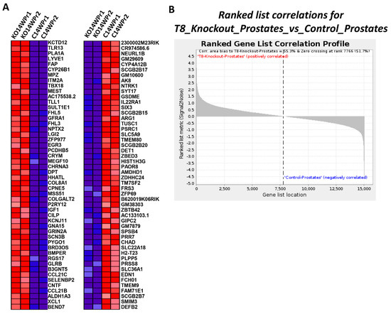 In TRPM8 knockout (KO) prostates, a distinct expression profile is observed, with multiple genes showing significant upregulation or downregulation, as displayed in Figure 7A,B and Table 3. The heatmap (Figure 7A) illustrates the top 50 significantly expressed up- and downregulated genes, with upregulated genes in red and downregulated genes in blue, emphasizing the prominent changes in TRPM8 KO prostates compared to controls. Figure 7B presents the ranked gene list correlation profile, revealing a positive correlation bias toward TRPM8 KO prostates, with 55.3% of the gene list correlating positively and a zero-crossing point at rank 7766 (51.7%). This positive shift underscores the broad molecular impact of TRPM8 deletion on prostate gene expression.