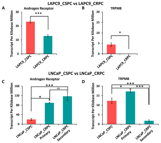 Gene expression in LAPC9 CSPC vs. CRPC and LNCaP CSPC vs. CRPC. The transcripts per kilobase million were obtained from the data extracted from the GSE88752 dataset and used to graph and compare the expression of the genes of interest: AR and TRPM8. (A) Expression of AR in LAPC9 CSPC is significantly higher than in CRPC (Student’s t-test: ***, p < 0.0001; n = 5). (B) Expression of TRPM8 in LAPC9 CSPC is significantly higher than in CRPC (Student’s t-test: *, p < 0.05; n = 5). (C) Expression of AR in LNCaP CSPC is significantly lower than in both primary and secondary CRPC (ANOVA with post hoc Tukey multiple comparisons of different cell types (ns, p > 0.05, *, p < 0.05, ***, p < 0.0001; n = 4). (D) Expression of TRPM8 LNCaP CSPC is significantly lower than in both primary and secondary CRPC (ANOVA with post hoc Tukey multiple comparisons of different cell types (*, p < 0.05, ***, p < 0.0001; n = 4).