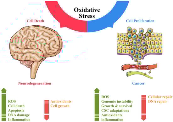 Oxidative stress (OS) is an established hallmark of cancer and neurodegenerative disorders (NDDs), which contributes to genomic instability and neuronal loss. This review explores the contrasting role of OS in cancer stem cells (CSCs) and NDDs. Elevated levels of reactive oxygen species (ROS) contribute to genomic instability and promote tumor initiation and progression in CSCs, while in NDDs such as Alzheimer’s and Parkinson’s disease, OS accelerates neuronal death and impairs cellular repair mechanisms. Both scenarios involve disruption of the delicate balance between pro-oxidant and antioxidant systems, which leads to chronic oxidative stress. Notably, CSCs and neurons display alterations in redox-sensitive signaling pathways, including Nrf2 and NF-κB, which influence cell survival, proliferation, and differentiation. Mitochondrial dynamics further illustrate these differences: enhanced function in CSCs supports adaptability and survival, whereas impairments in neurons heighten vulnerability. Understanding these common mechanisms of OS-induced redox imbalance may provide insights for developing interventions, addressing aging hallmarks, and potentially mitigating or preventing both cancer and NDDs.