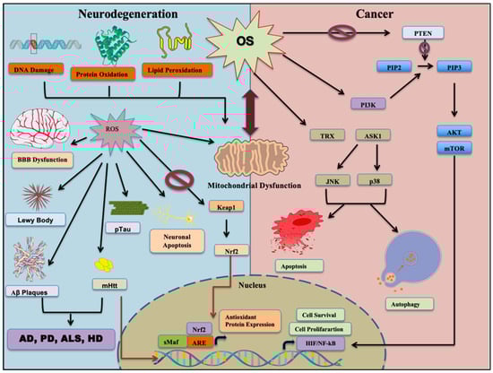 The shared pathways of OS in cancer and NDDs suggest the potential of targeting redox imbalances in both conditions [73]. For instance, the endocannabinoid system modulates redox-state-dependent cell death and inflammation in NDDs [74], whereas cancer cells activate redox-sensitive transcription factors as an adaptive response [75]. Understanding these shared pathways may lead to the development of novel therapeutic strategies. However, the complex role of OS necessitates careful consideration when developing targeted interventions.